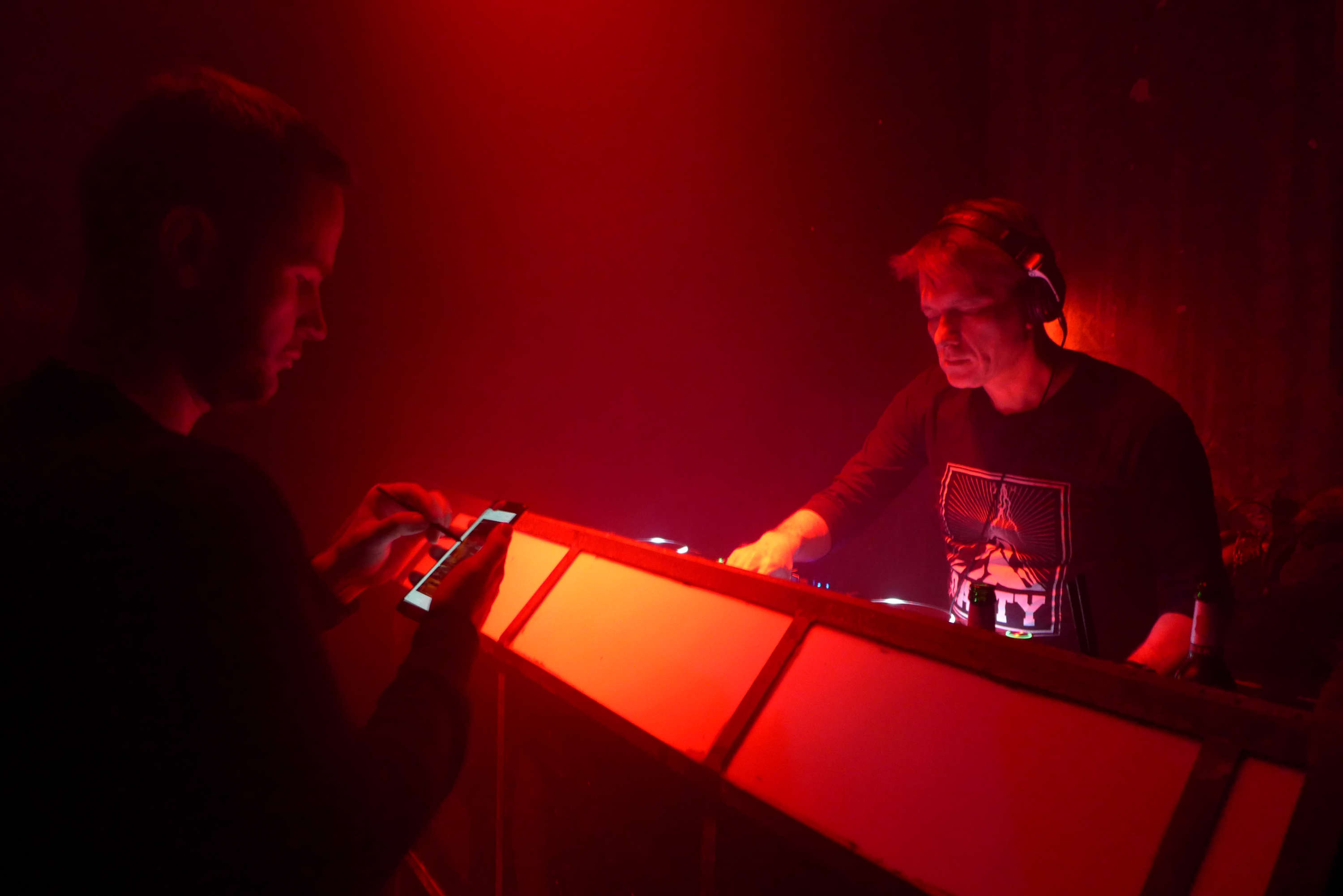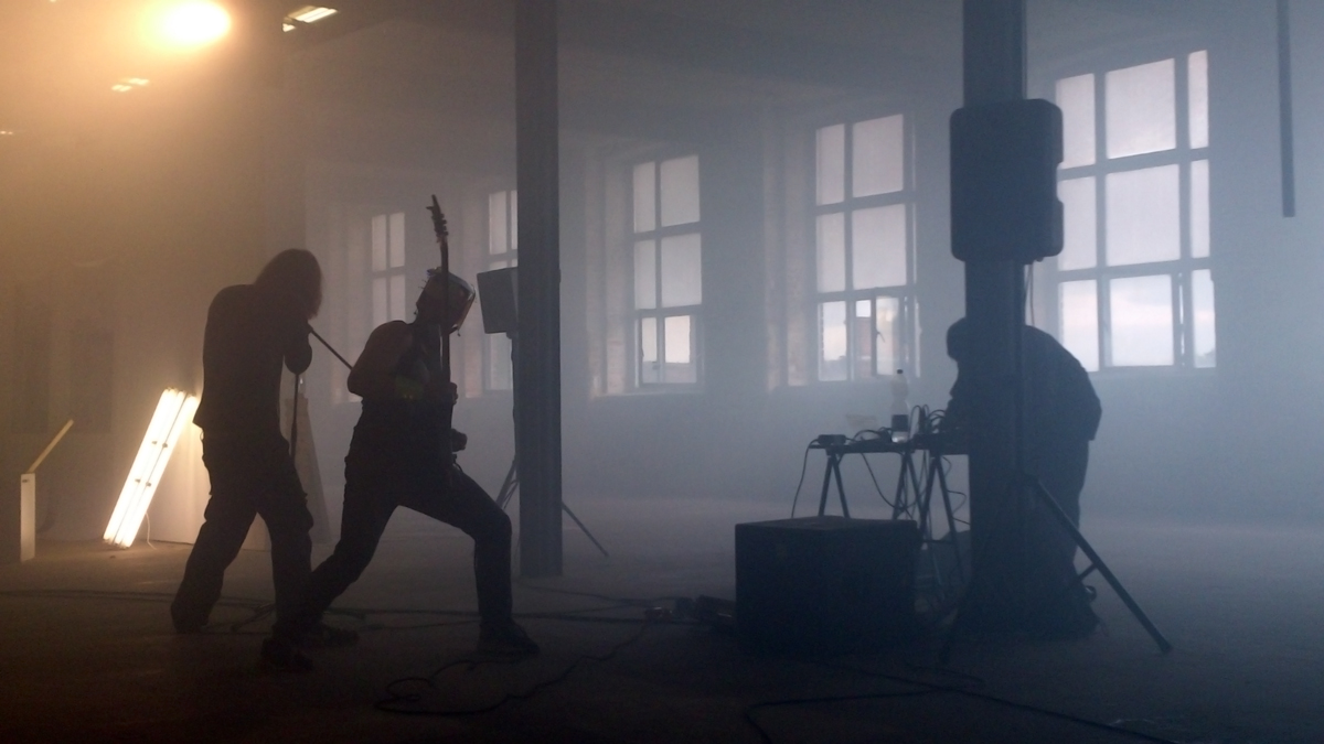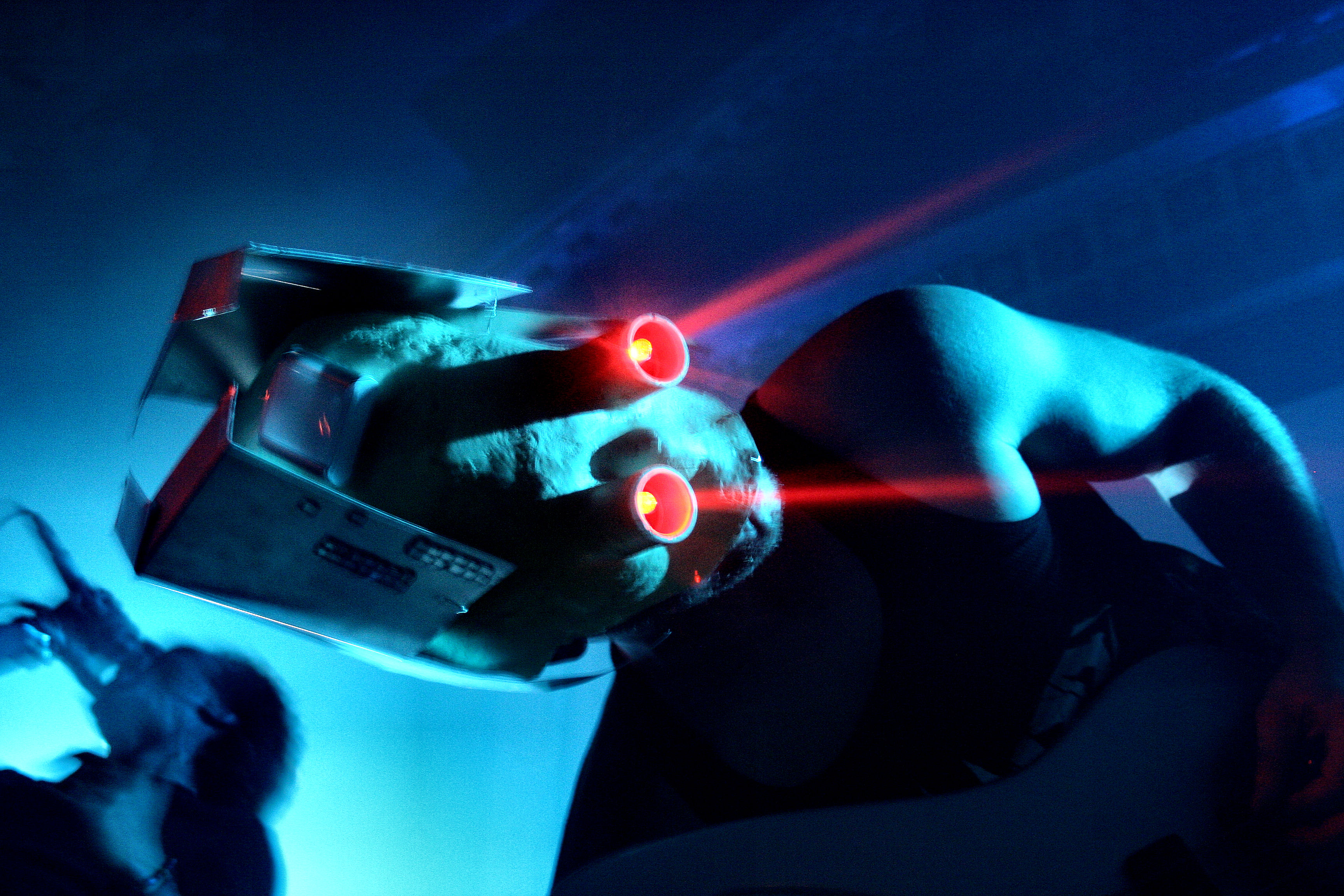 "Torsten Burkhardt & Andreas Hachulla performing Denied Reality as Trüe Deined @ UT Connewitz" 2009 Photo: © Sebastian Kiss / helmetdesign & craft Andreas Hachulla
