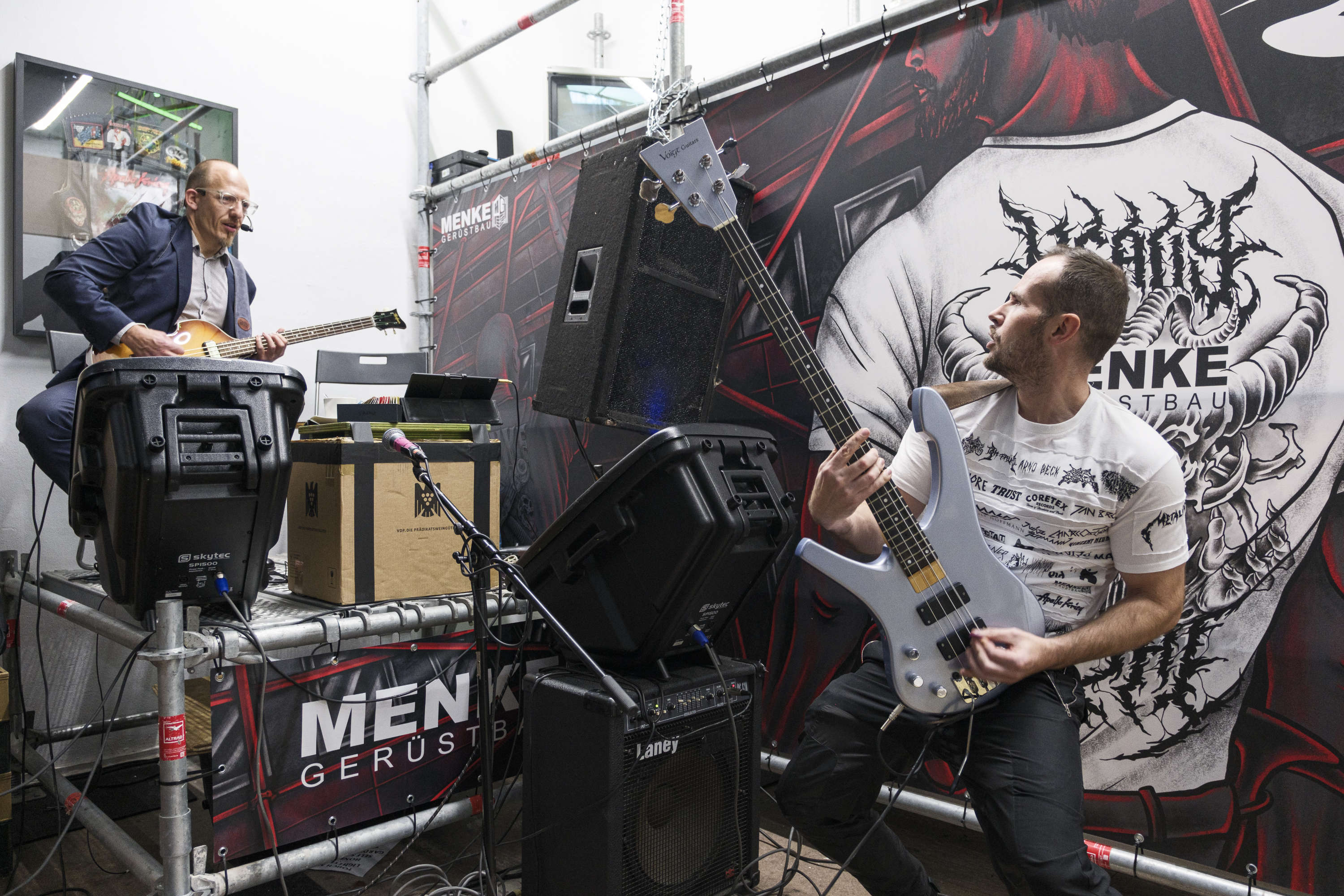 Bass Duel w Prof. Dr. Jörg Scheller after the MALMZEIT headliner gig of METALMORPH @ Schau Fenster, Berlin 2024 groupshow curated by Jan Brokof & Andreas Hachulla / Photo: Marian Luft, T-Shirt by Susanne Ostwald, Scaffolding Stage by MENKE Gerüstbau, iceblue bassdesign Andreas Hachulla crafted by Voigt Guitars